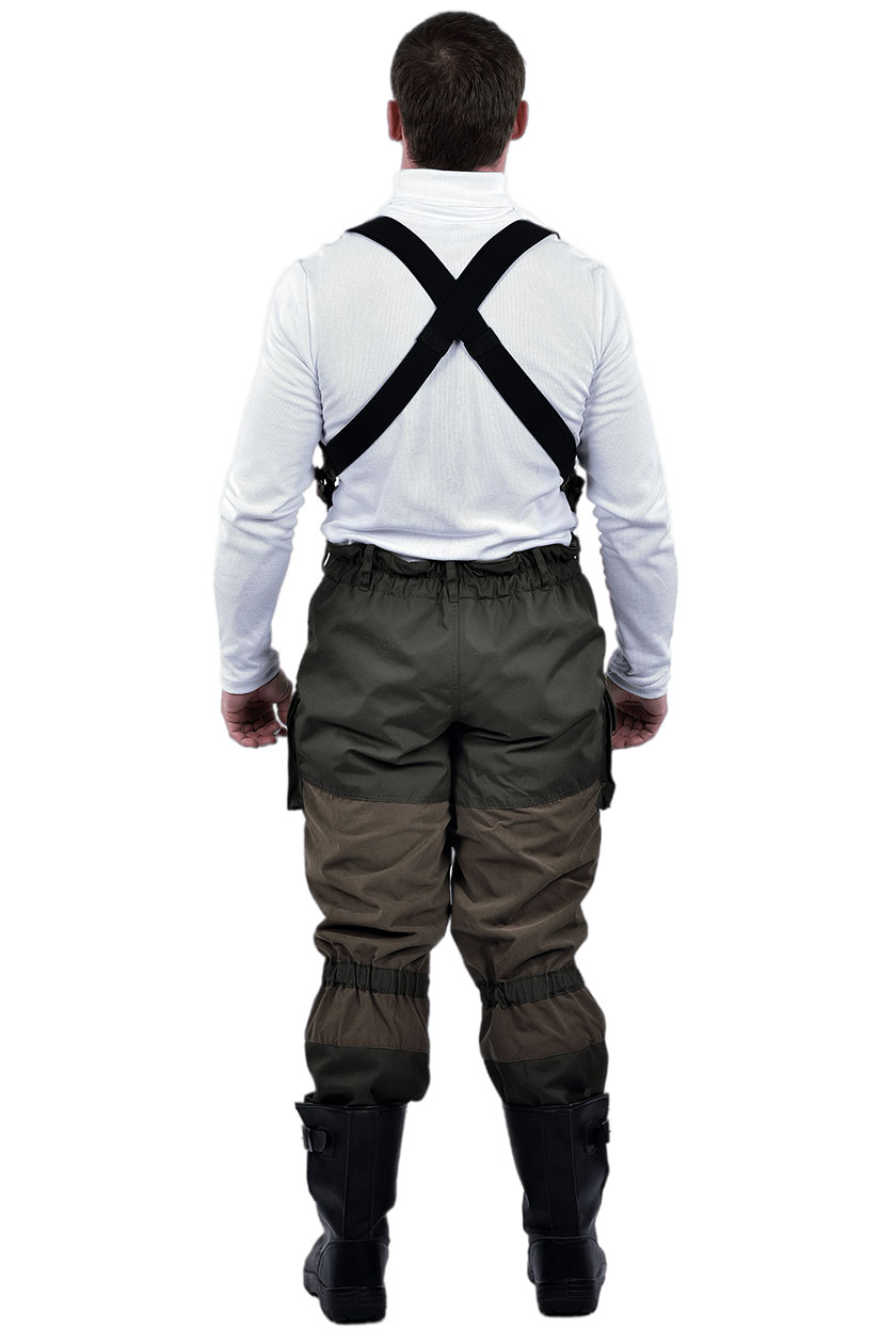 В области сидения задней половинки, на уровне колена на передней половинке и по низу брюк расположены накладки от истирания. Брюки с кулисой ниже колена на задней половинке и низ брюк стянутой эластичной лентой. По низу брюк с изнанки притачен напульсник из бязи с завязками для фиксации по ноге.